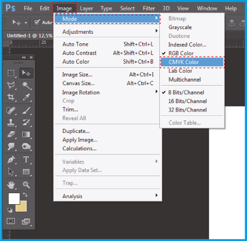 3.1 .Prima di salvare il documento, assicurati di inserirlo in CMYK in modo che non ci siano cambiamenti di colore. Vai a Immagine> Modalità> Colore CMYK .