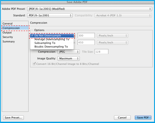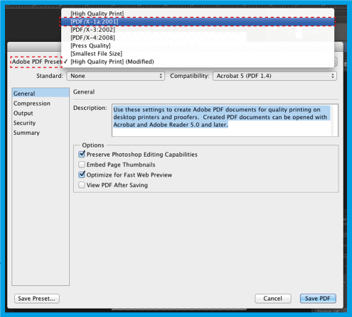 3.3 .Nella finestra che si apre, in Adobe PDF Preset seleziona [PDF/X-1a: 2001] Questa opzione garantisce che il PDF non soffra alterazioni.