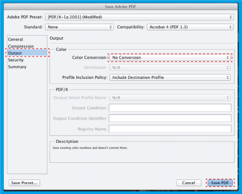 3.5 .Quindi seleziona Output e sul lato destro in Conversione colore Questa opzione garantisce di salvare il file senza alcun prompt di colore, quindi fai clic su Salva predefinito ..., salva in PDF con il nome che desideri, in modo da poterlo riutilizzare cliccando in Salva PDF .